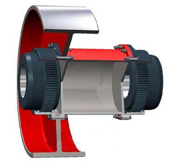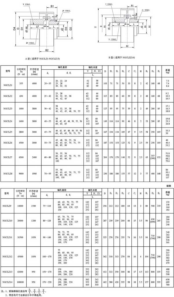 大轉(zhuǎn)矩鼓形齒式聯(lián)軸器承載沖擊性能好,但齒面接觸應(yīng)力和齒根彎曲疲勞強(qiáng)度要求高,如果我們采取特殊結(jié)構(gòu)、特殊材料、特殊工藝,那么該聯(lián)軸器就能夠滿足大直徑軋管機(jī)的要求。隨著我國(guó)經(jīng)濟(jì)的發(fā)展,大直徑軋管機(jī)需求增加,其主傳動(dòng)使用聯(lián)軸器的要求也越來(lái)越高,滿足該要求的聯(lián)軸器有十字式萬(wàn)向聯(lián)軸器和大轉(zhuǎn)矩鼓形齒式聯(lián)軸器,其中十字式萬(wàn)向聯(lián)軸器轉(zhuǎn)矩可以達(dá)到,但承載沖擊性能差、壽命短,這是一個(gè)很大的缺點(diǎn);目前國(guó)內(nèi)軋機(jī)用的標(biāo)準(zhǔn)聯(lián)軸器無(wú)法滿足要求,只達(dá)到需求轉(zhuǎn)遞轉(zhuǎn)矩的1/2~1/3,國(guó)外聯(lián)軸器專業(yè)制造商可以滿足要求,但由于它采用專門的技術(shù),再加上制造難度大,所以價(jià)格特別昂貴。一臺(tái)軋管機(jī)需要10套左右,再加上備件外購(gòu)費(fèi)用很大。天碩聯(lián)軸器廠根據(jù)客戶需求研制的各種鼓形齒聯(lián)軸器已能滿足國(guó)內(nèi)各廠家的需求。所謂鼓形齒即為將外齒制成球面,球面中心在齒輪軸線上,齒側(cè)間隙較一般齒輪大,鼓形齒聯(lián)軸器可允許較大的角位移(相對(duì)于直齒聯(lián)軸器),可改善齒的接觸條件,提高傳遞轉(zhuǎn)矩的能力,延長(zhǎng)使用壽命。有角位移時(shí)沿齒寬的接觸狀態(tài)。具有徑向、軸向和角向等軸線偏差補(bǔ)償能力,具有結(jié)構(gòu)緊湊、回轉(zhuǎn)半徑小、承載能力大、傳動(dòng)效率高、噪聲低及維修周期長(zhǎng)等優(yōu)點(diǎn),特別適用于低速重載工況,如冶金、礦山、起重運(yùn)輸?shù)刃袠I(yè)、也適用于石油、化工、通用機(jī)械等各類機(jī)械的軸系傳動(dòng)鼓形齒式聯(lián)軸器屬于剛撓性聯(lián)軸器,齒式聯(lián)軸器是由齒數(shù)相同的內(nèi)齒圈和帶外齒的凸緣半聯(lián)軸器等零件組成。外齒分為直齒和鼓形齒兩種齒形,齒式聯(lián)軸器在工作時(shí),兩軸產(chǎn)生相對(duì)角位移,內(nèi)外齒的齒面周期性作軸向相對(duì)滑動(dòng),必然形成齒面磨損和功率消耗,因此,齒式聯(lián)軸器需在有良好和密封的狀態(tài)下工作。齒式聯(lián)軸器徑向尺寸小,承載能力大,常用于低速重載工況條件的軸系傳動(dòng),高精度并經(jīng)動(dòng)平衡的齒式聯(lián)軸器可用于高速傳動(dòng),如燃汽輪機(jī)的軸系傳動(dòng)。 NGCLZ型帶制動(dòng)輪鼓形齒式聯(lián)軸器 基本參數(shù)和主要尺寸