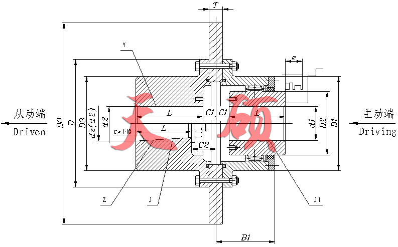 一般情況下,PGCLZ型聯(lián)軸器應(yīng)與GICLZ型聯(lián)軸器配對使用,外齒軸套端與中間軸聯(lián)接,兩端半聯(lián)軸器則分別與工作機(jī)軸和動力機(jī)軸聯(lián)接。由于制動盤與半聯(lián)軸器連接在一起,制動盤的重量以及工作制動負(fù)荷與振動完全由半聯(lián)軸器承受,改善了制動時鼓形齒的嚙合性能,因此適用于重載場合,傳遞公稱轉(zhuǎn)矩為630~112000 N·m。