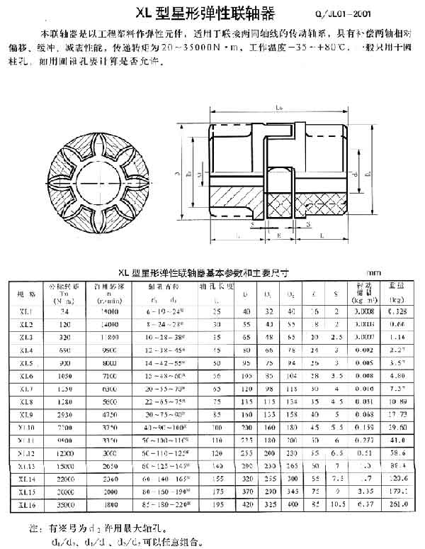 XL型星形彈性聯軸器基本性能參數和主要尺寸