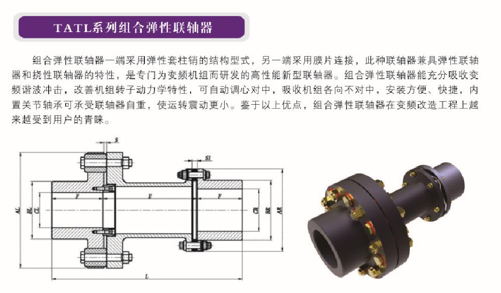 聯軸器型號 功率 / 轉速 (Kw/rpm) 公稱扭矩 (KNm) *大許用轉速 (r/min) AL/AR (mm) BL/BR (mm) CL/CR max (mm) S/S1 (mm) E (mm) F (mm) L (mm) TATL6196 0.25 2.38 2850 250/196 165/133 110/95 3/14 160 100 360 TATL6210 0.30 2.94 27......