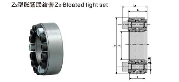 特性:Z2型脹緊套由一個開口的雙錐內環,一個開口的雙錐外環和兩個雙錐壓緊環組成。用內六角螺栓擰緊,擰緊時彈性環沒有相對于軸轂的軸向移動,與Z1型比較,同樣壓緊力能產生更大的徑向壓力,傳遞更大的載荷。為便于拆卸,在一個壓緊環上有拆卸用螺孔,沿圓周共有2~4處。鎖緊聯結盤廣泛應用于包裝、印刷、紡織、機床等機械上。