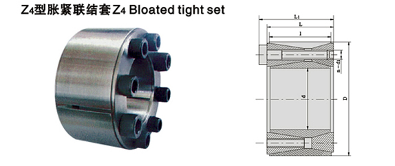 Z4型脹套特性: Z4型脹套由錐度不同的開口雙錐內環與開口雙錐外環及兩個雙錐壓緊環組成,用內六角螺栓鎖緊。與Z2型比較,結合面長,對中精度高,用于旋轉精度要求較高和傳遞較大載荷的場合。